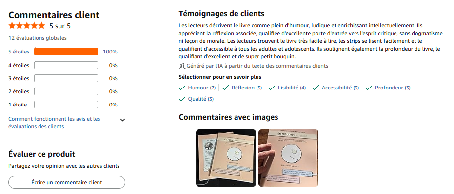 Notez qu’il y a déjà, au moment où j’écris ces lignes, 12 évaluations avec commentaires enthousiastes, et une jolie note de 5 étoiles ! (si vous avez le livre, je vous encourage vivement à laisser une éval. Merci pour lui 🙂 )