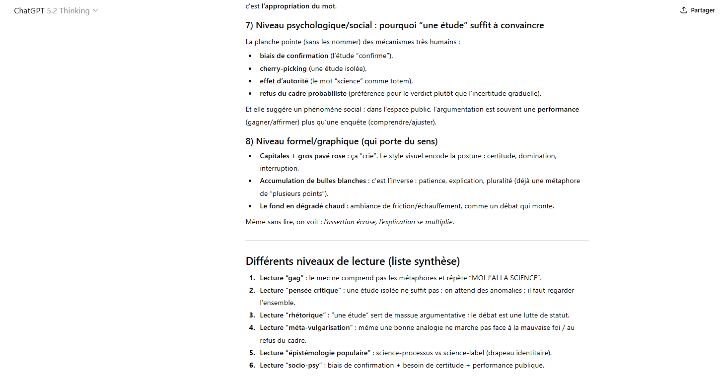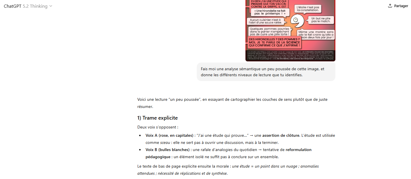 Et tiens, j’y retourne, car j’aime bien par curiosité demander a posteriori à ChatGPT comment il lit l’image (conclusion : parfaitement). Pour vous, ça peut faire office de « solution » : avez-vous identifié les différents niveaux de lecture proposés ?