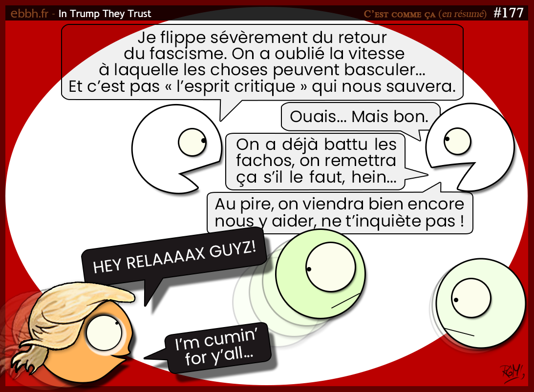 Pas mal. J’ajouterai que je souligne aussi un point pas négligeable dans l’épisode : ceux qui nous inquiètent aujourd’hui sont ceux qui ont contribué de façon décisive à la défaite du nazisme (USA et URSS).