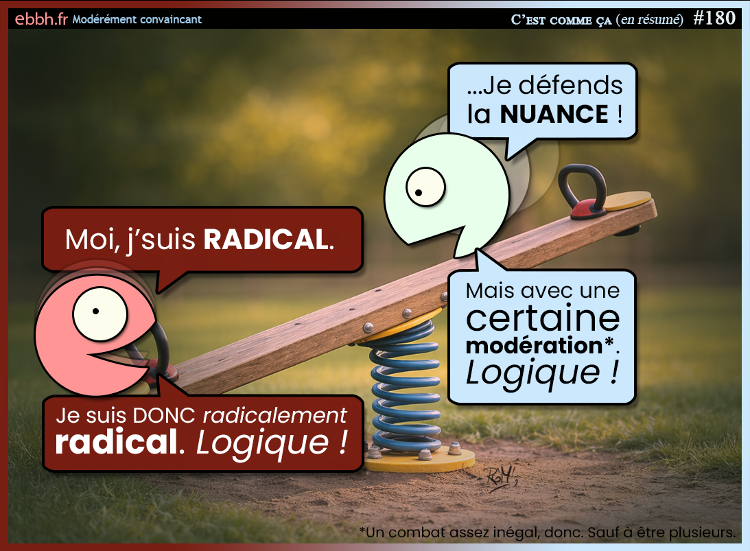 L’image repose sur une métaphore très simple et très efficace : une balançoire penche du côté du personnage qui se dit “radical”, comme s’il “pesait” davantage dans l’échange. En face, le personnage qui défend la nuance semble plus léger, donc moins influent dans ce rapport de force.
