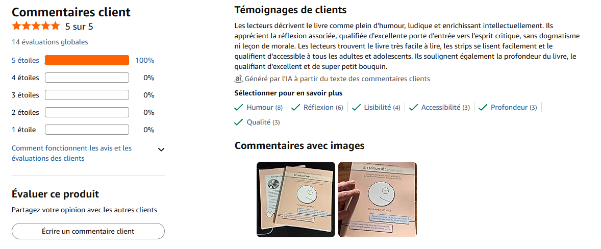 Notez qu’il y a déjà, au moment où j’écris ces lignes, 14 évaluations avec commentaires enthousiastes, et une jolie note de 5 étoiles ! (si vous avez le livre, je vous encourage vivement à laisser une éval. Merci pour lui 🙂 ) Je vous mets le résumé qu’en fait actuellement l’IA [sur la première édition !] :