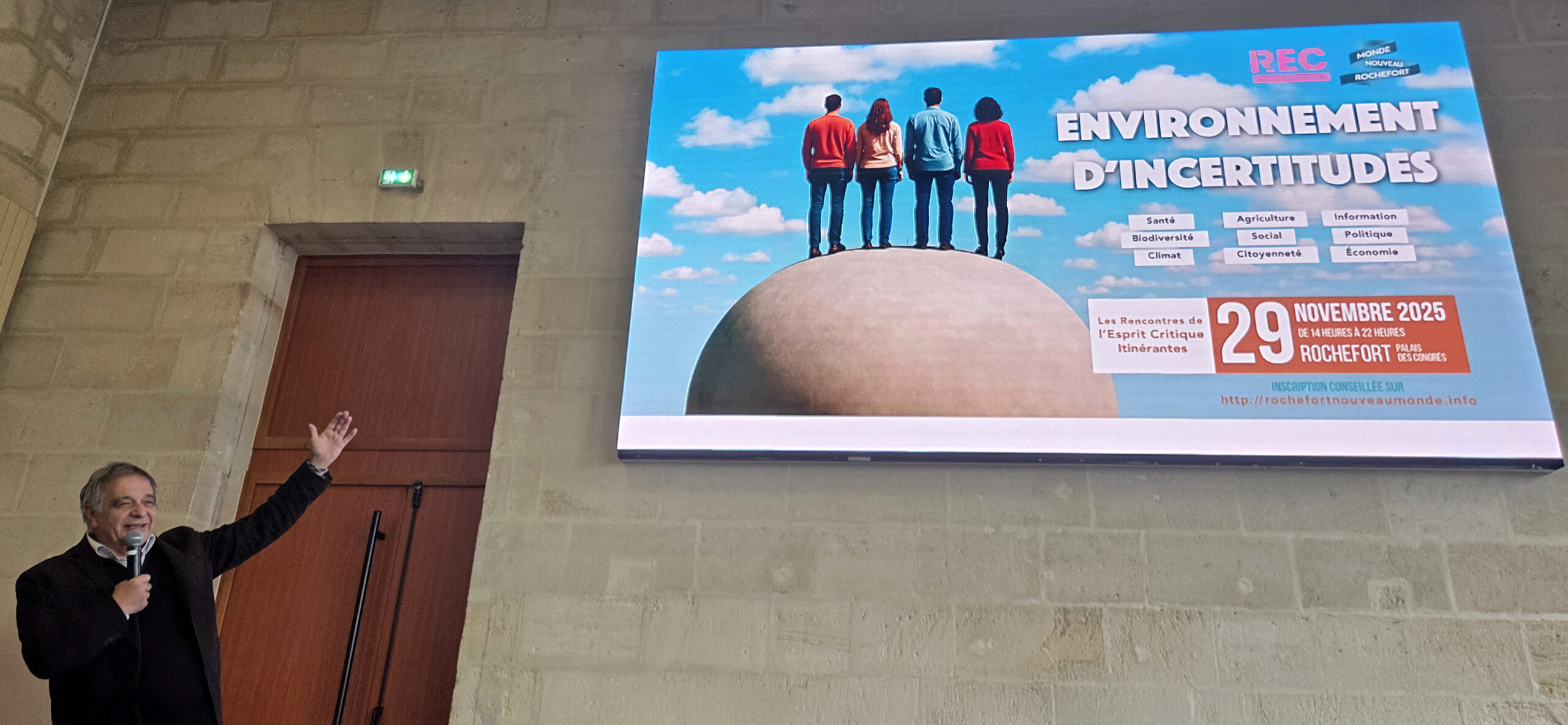 Lors du festival des « Rencontres de l’Esprit Critique » (REC) de Rochefort le 29 novembre 2025, avec l’association Rochefort Nouveau Monde et le tout nouveau comité local de l’Afis (Association française pour l’information scientifique) de Charente-Maritime.