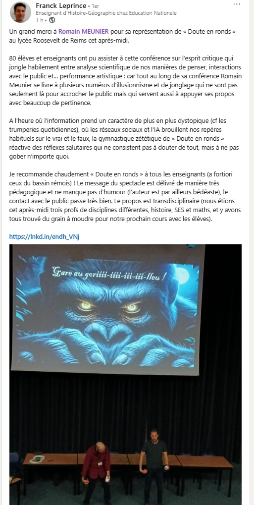 Au lycée Franklin Roosevelt à Reims, le 15 janvier 2026, devant 3 classes et environ 80 élèves de seconde et première. Une excellent moment, des élèves attentifs, participatifs et sympathiques. Voici le retour fait sur LinkedIn par l’enseignant qui m’a sollicité, pour la seconde fois :